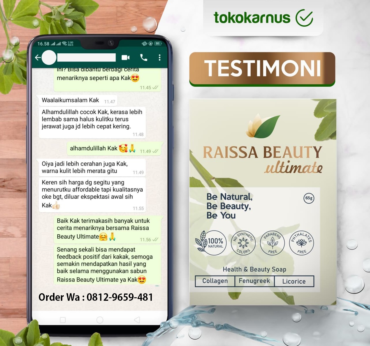 Raissa Beauty Ultimate Salah satu sabun kecantikan yang diformulasi berbahan alami ialah collagen, fenugreek, licorice, tea tree oil, vitamin C serta vitamin E.